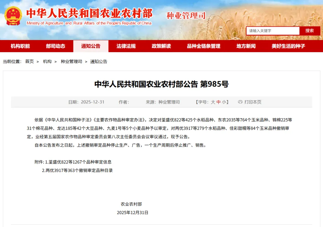 近日,农业农村部发布公告,共审定通过水稻品种425个、玉米品种764个、棉花品种31个、大豆品种42个、小麦品种5个。东亚种业3个玉米品种通过国家审定。