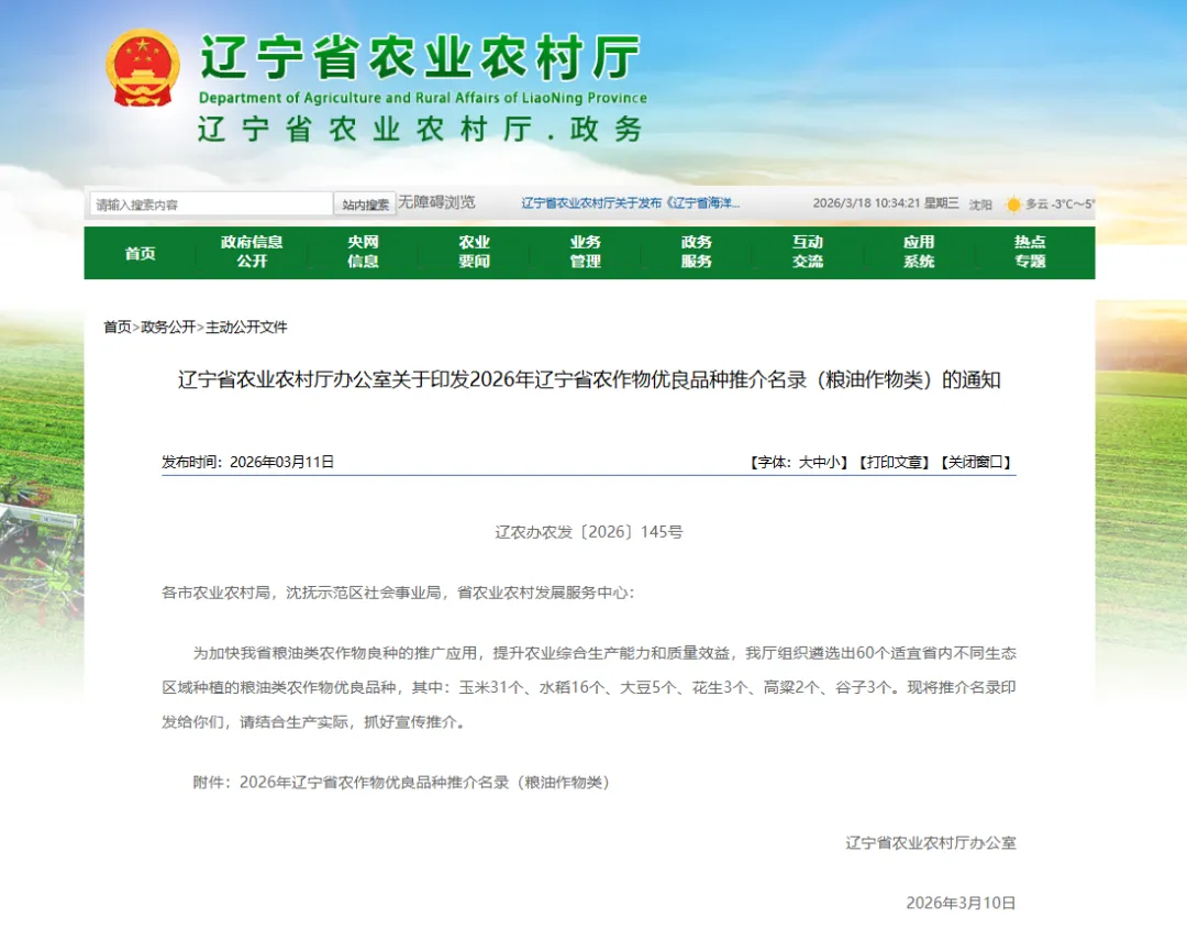 近日,辽宁省农业农村厅发布了2026年辽宁省农作物优良品种推介名录,辽宁东亚种业自主培育的东单1331、东科1188、丰平108入选2026年辽宁省农业主导品种。