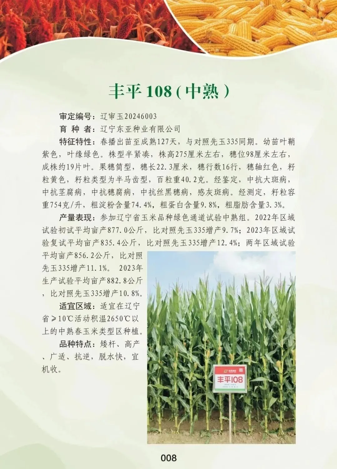 丰平108是辽宁东亚种业有限公司自主研发的中熟玉米品种,适宜在辽宁省≥10℃活动积温2650℃以上的中熟春玉米类型区种植。